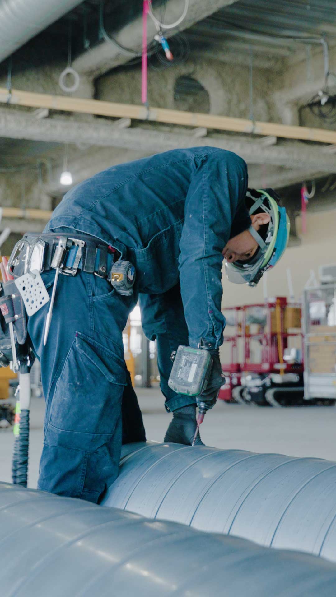 建物の中に空気の通り道(ダクト)をつくり、取り付けます。主に、空調・換気・排煙といった設備に関わり、工場やビル、商業施設、病院など、さまざまな建物で活躍します。設計図をもとにダクトを加工し、現場で天井裏や壁の中に取り付け、快適な室内環境を支える重要な役割を担う仕事です。