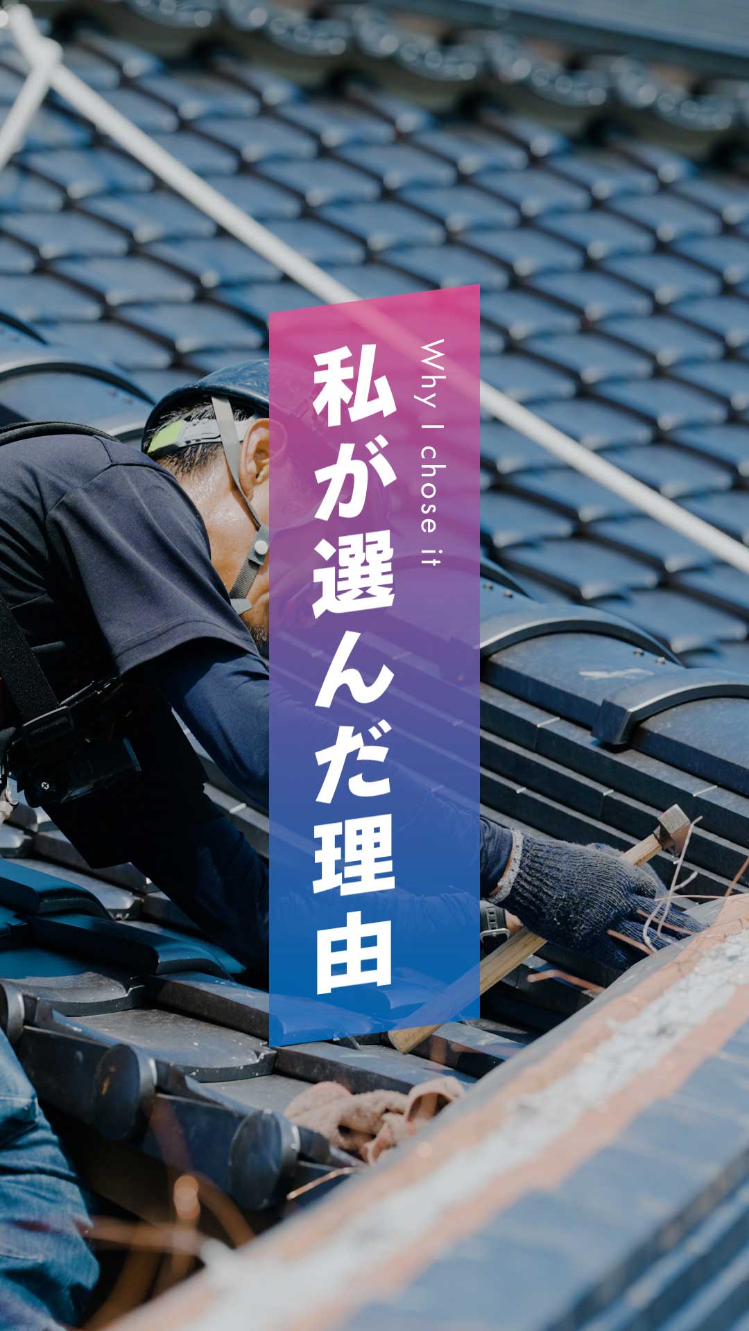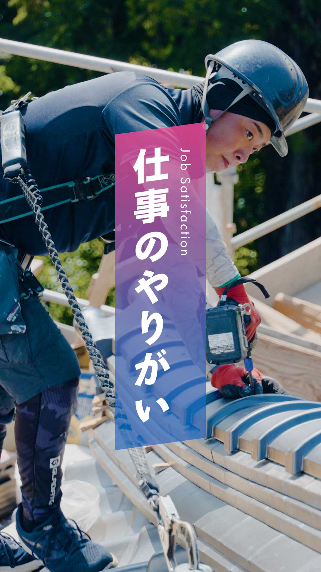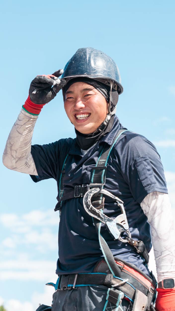 親の紹介でこの世界に飛び込みました。高い所は苦手じゃなかったのですが、最初は右も左も分からず、すべてが新鮮でした。6年目ですがまだまだ勉強中です。最初の現場は警察官舎の改修工事で、厳重な警備の中で作業したことが今でも印象に残っています。最近現場の流れも少しずつ見えてきて、屋根の上の仕事の面白さを実感しています。