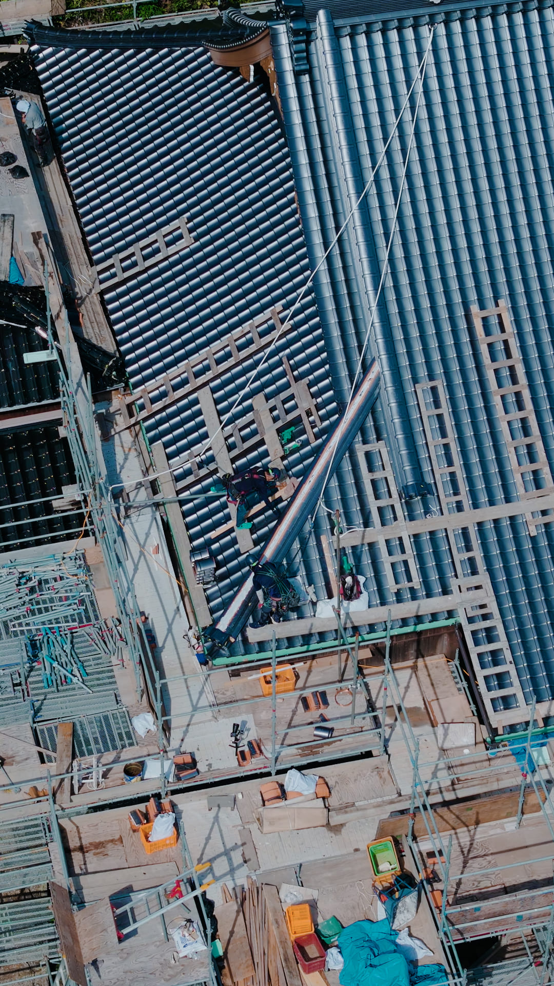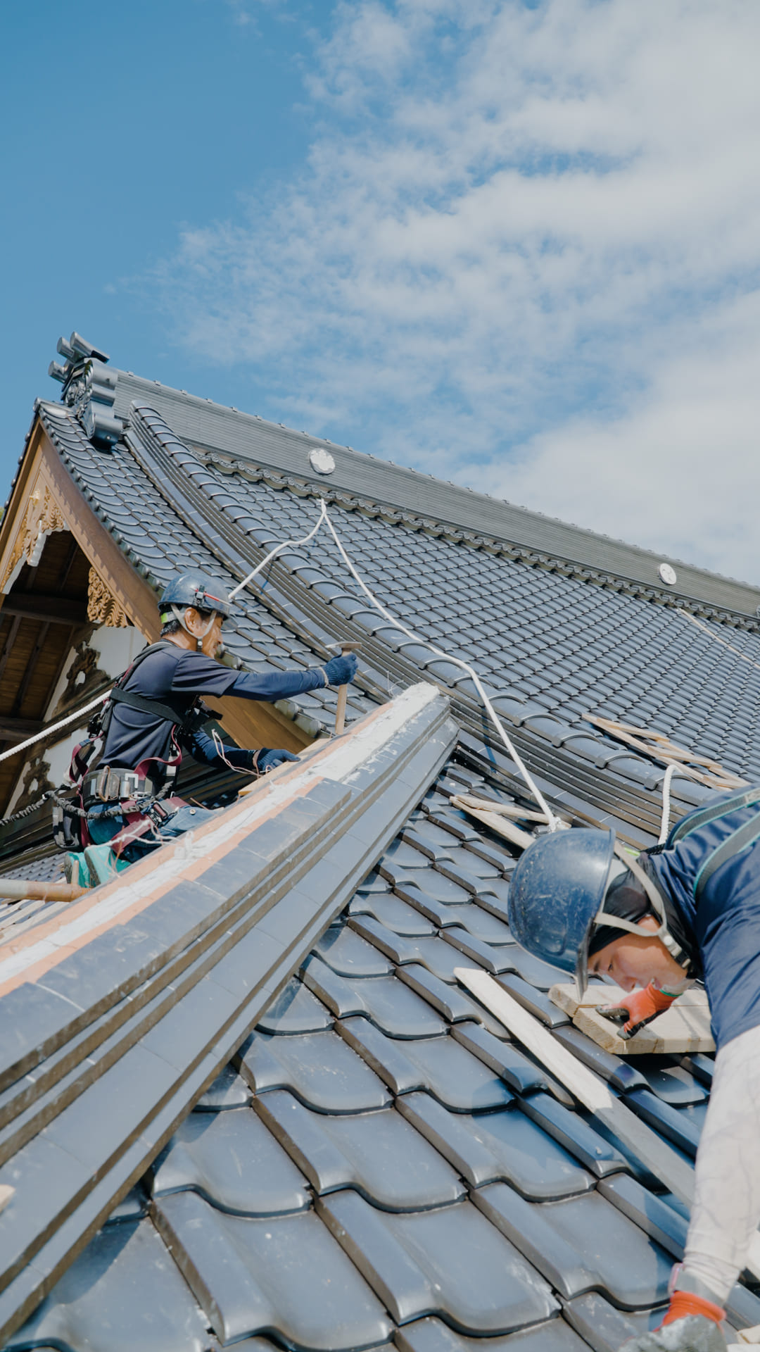 屋根は建物ごとに形や勾配、使われている素材が異なります。そのため、葺師は現場ごとに施工方法を考え、調整しながら作業を進めます。特に古い建物や文化財では、当時の工法を再現しながら施工することも。屋根を通して建物の歴史や背景と向き合う、奥深い仕事です。