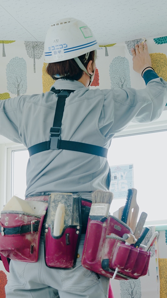 建物の内部空間を美しく快適に仕上げる職人を指します。一般住宅から商業施設、オフィス、学校や病院などの公共施設まで幅広く手掛け、クロス、フローリング、カーペット、天井などの「見える部分」を仕上げる建築工事の最終の仕上げという重要な役割を担います。